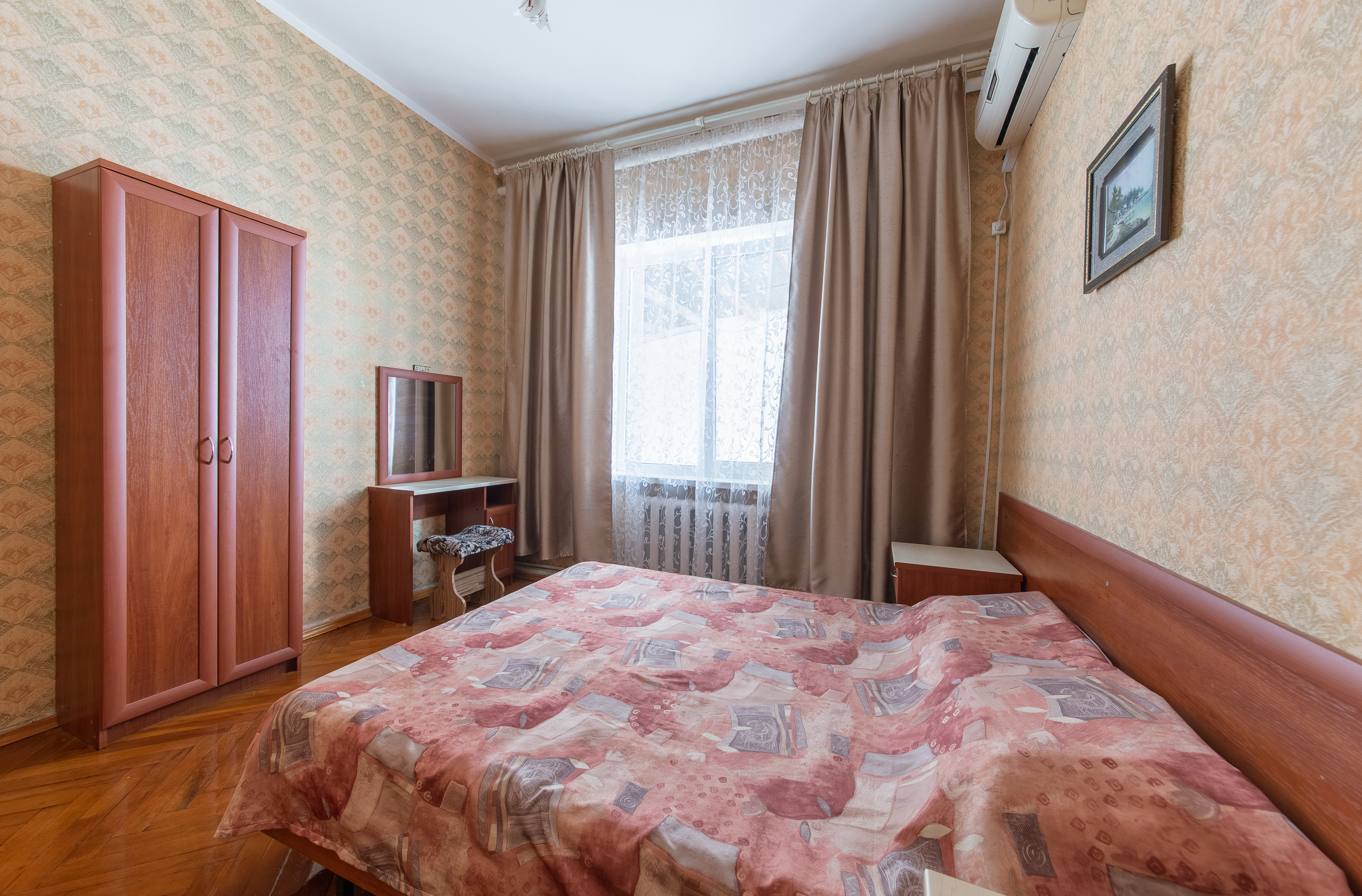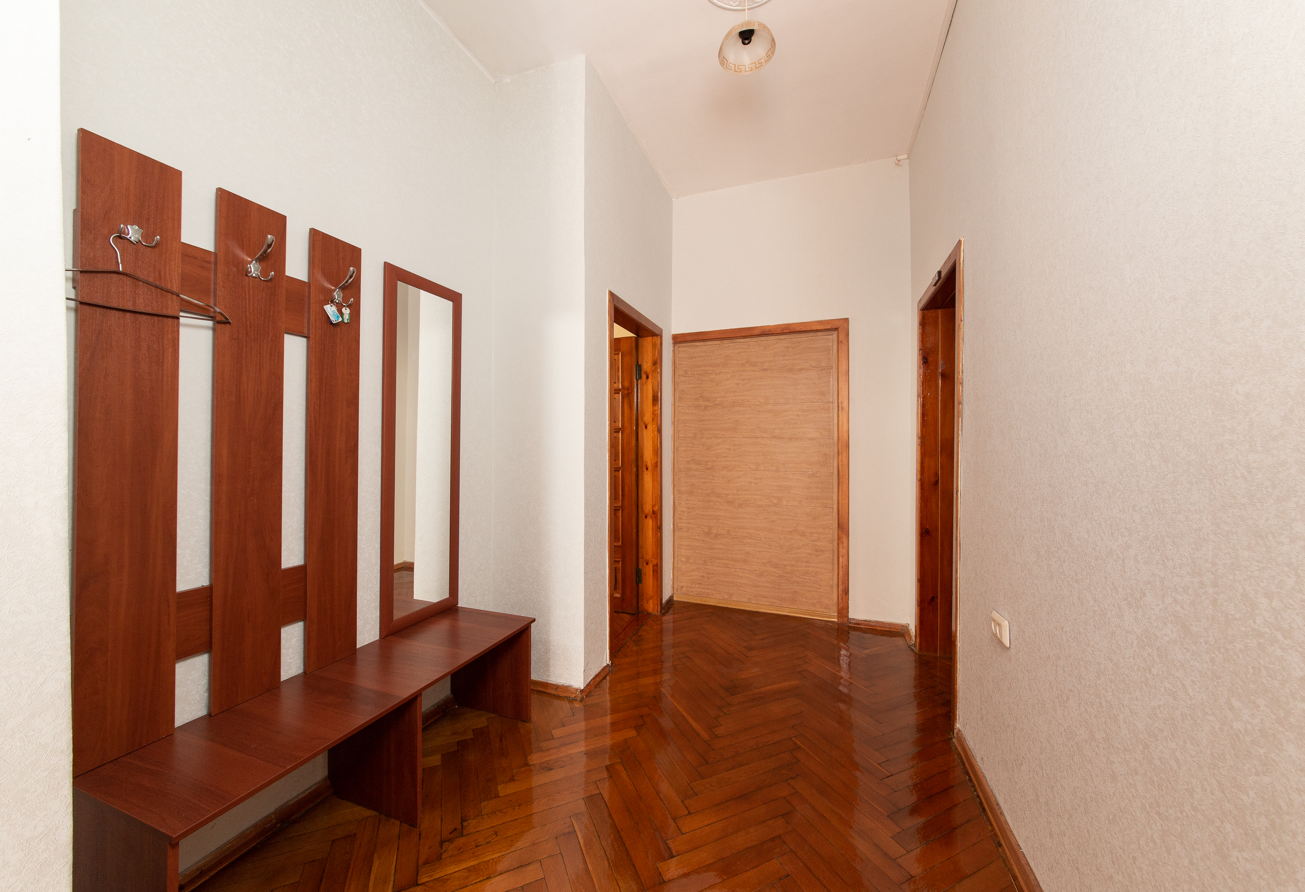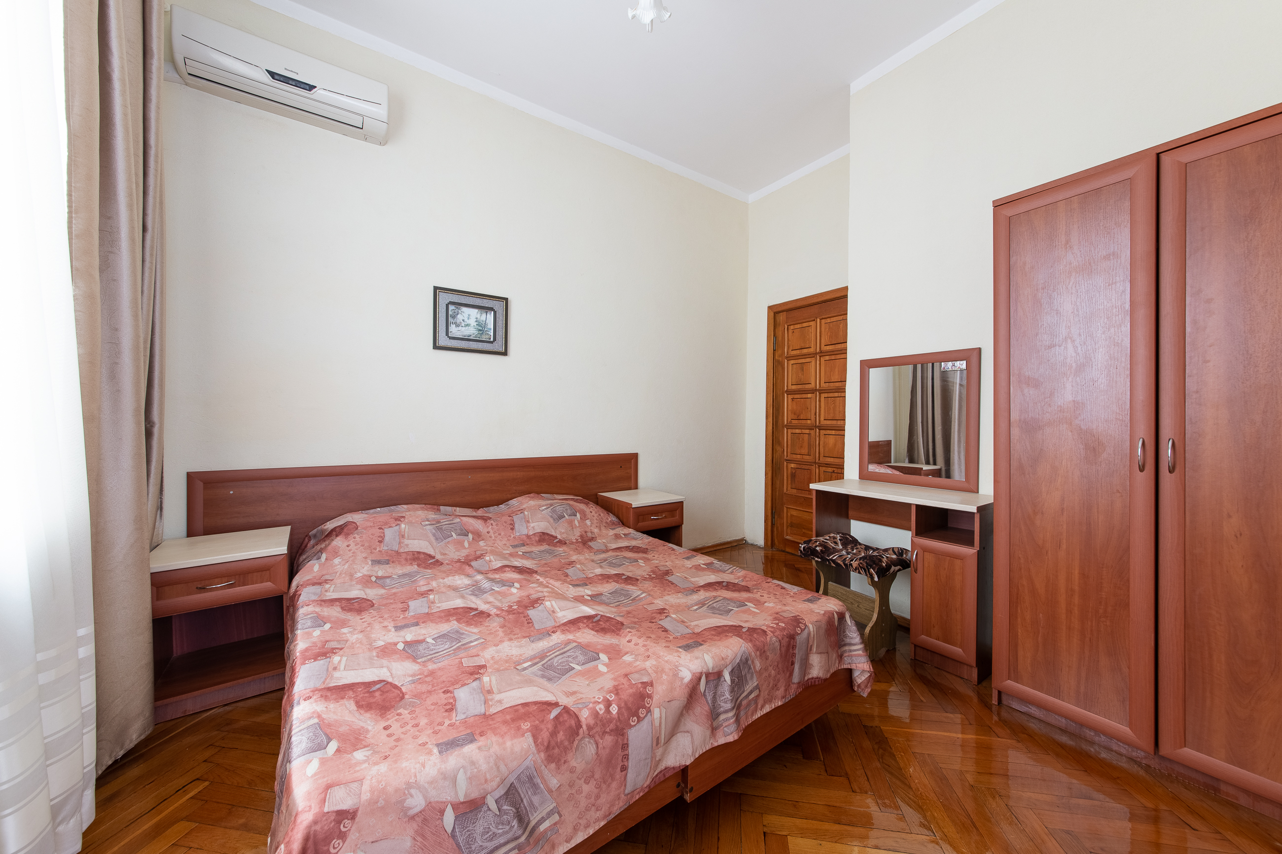- Мебель: вешалка, зеркало, кровать двуспальная, прикроватные тумбочки, стол, стулья, шкаф